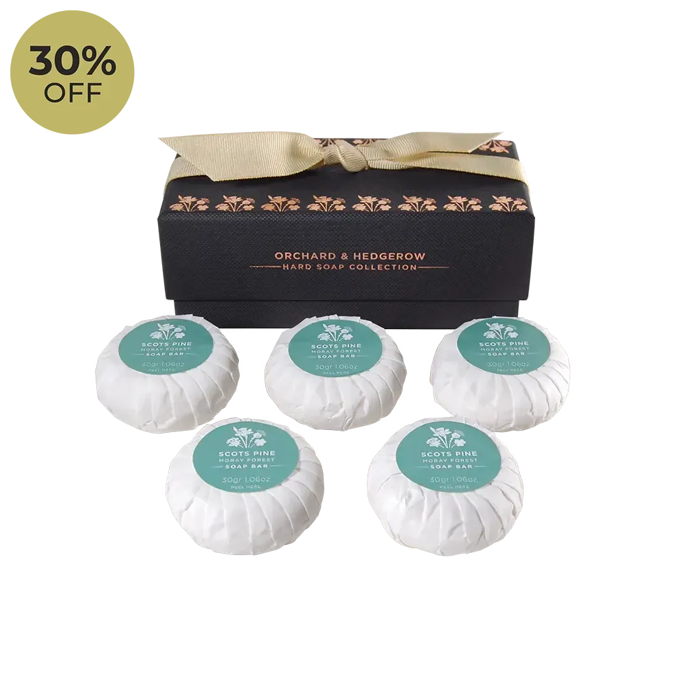The Scots Pine Hard Soap collection, contains five Hard Soaps their individual packaging makes them ideal for travelling, last-minute weekend getaways or your guest bathroom. Our Scots Pine Luxury Soap bars are vegan, cruelty free and in recyclable packaging.